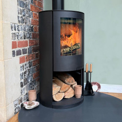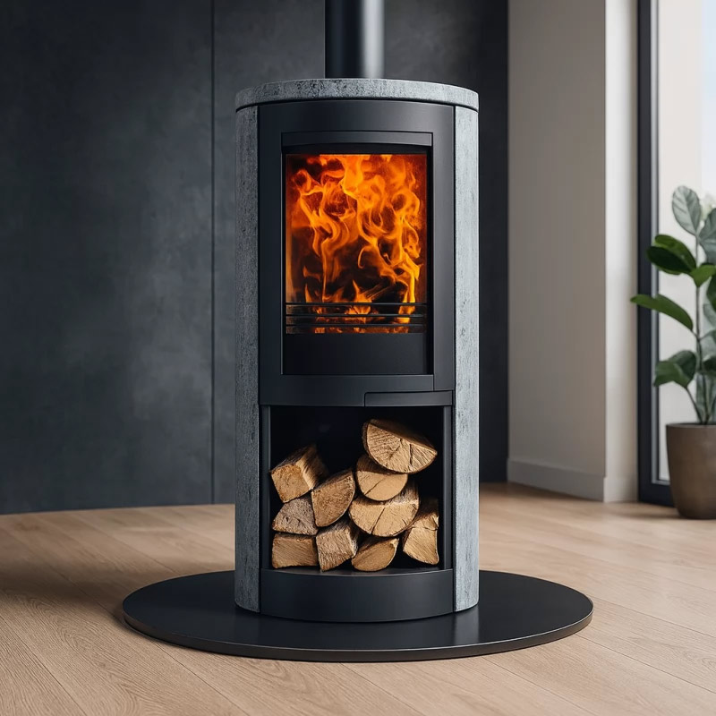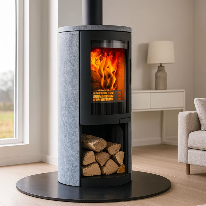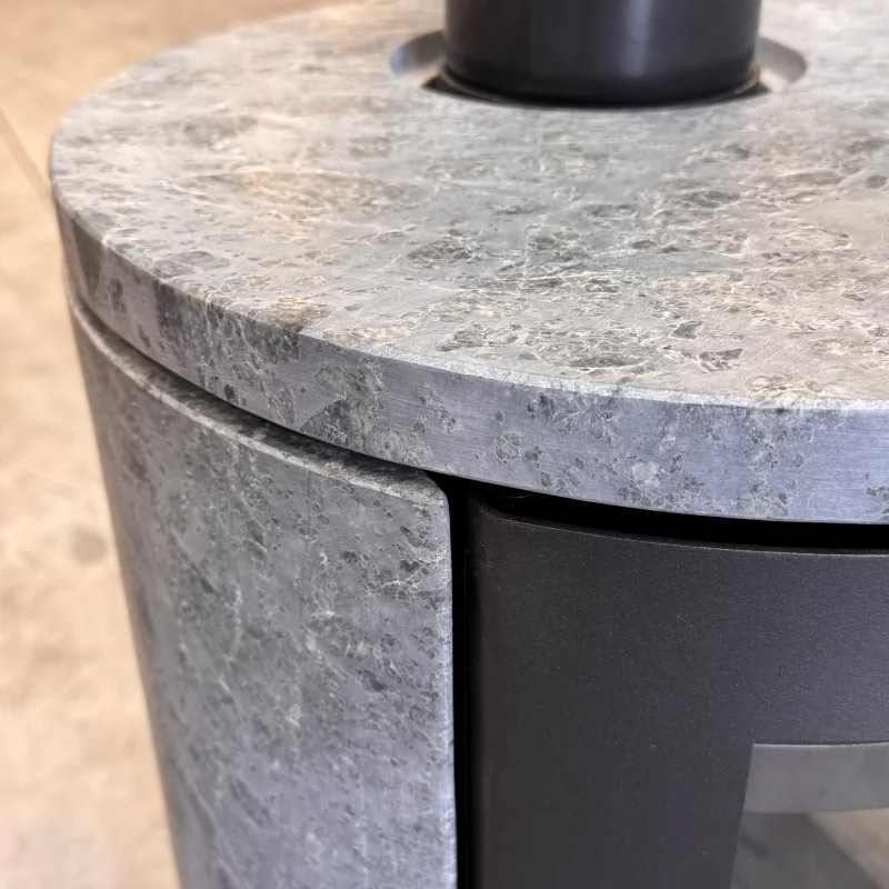 Cylindrical soapstone multi-fuel stove, built from quality steel with soapstone top and sides